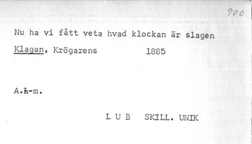 //// /V o //// - ¦ ¦ - //// Nu ha vi fått veta hvad klockan är slagen Klagan, Krögarens 1885 //// A. fe-m• //// i i //// i //// L U B SKILL. UNIK ////