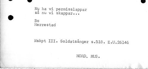 //// Nu ha vi permisslappar så nu vi skappar... //// ® Bo //// Herrestad //// Mskpt III. Soldatsånger s.518. E.U.26146 //// nord. mus. //// i \f- , Ml 11 ////