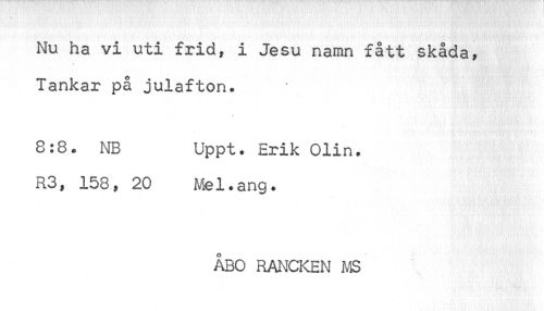 //// Nu ha vi uti frid, i Jesu namn fått skåda, Tankar på julafton. //// I il .'M ; [m^jm^^KK^^OH^ra^Wri' 5 uftfflR».' //// 8:8. NB Uppt. Erik Olin. //// R3» 153» 20 Mel.ang. //// ÅBO RANCKEN MS ////