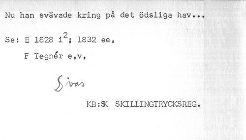 //// Nu han svävade kring på det ödsliga hav*.. //// Se: E 1828 1832 eef F Tegnér etv* //// KB:3C SKILLINGTRYCKSREG. ////