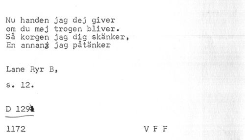 //// Nu handen jag dej giver //// om du mej trogen bliver. //// Så korgen jag dig skänker, //// En annans jag påtänker //// Lane Ryr B, s. 12. //// D 1294 //// 1172 V F F ////