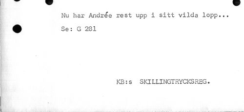 //// Nu har Andrée rest upp i sitt vilda lopp.*. 0 Se: G 231 //// KB:s SKILLINGTRYCKSREG. //// \ ////