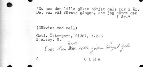 //// Det var väl första gången, som jag hörde den //// i år.11 //// r //// (Gökvisa med mell) //// * -. //// Gotl. Östergarn, 21387, s.2-3 i •Bjersby, R. //// 2 U L M A ////