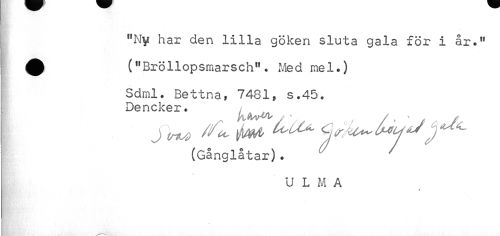 //// "Ny har den lilla göken sluta gala för i år.11 £ ("Bröllopsmarsch". Med mel.) //// Sdml. Bettna, 7481, s.45. Dencker. //// (Gånglåtar). //// U L M A //// » ////
