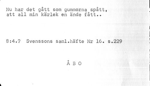 //// Nu har det gått som gummorna spått, //// att all min kärlek en ände fått.» f //// r i I //// I //// i i //// i //// 8:4.? Svenssons saml.häfte Nr 16. s.229 ! //// t //// ÅBO //// i i 1 ////