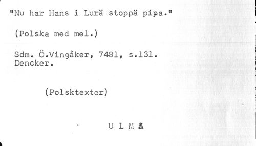 //// I //// f,Nu har Hans i Lura stoppa pipa.11 I //// i //// (Polska med mel.) //// Sdm. Ö.Vingåker, 7481, s.131. Deneker. //// i //// (Polsktexter) //// ' • öjuyi mm'! ¦ f //// U L M å ////