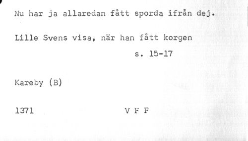 //// Nu har ja allaredan fått sporda ifrån dej. //// i //// Lille Svens visa» när han fått korgen //// s. 15-17 //// Kareby (B) //// 1371 V F F ////