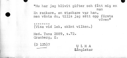 //// "Nu har jag blivit gifter och fått mig en //// man //// •En rackare, en stackare var han, men vänta du, tills jag sätt opp första //// väven" //// (Visa vid lek, okänt vilken.) //// Med. Tuna 2889,.s.72. Granberg, E# //// 121>? U L M A //// Sånglekar //// ... f f //// . . .... . ... _ ..... .V .. ....-W- ////