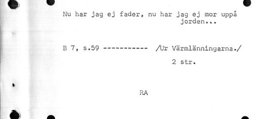//// v ^ //// Nu har jag ej fader, nu har jag ej mor uppå //// jorden.*. //// B 7, s.59------ /Ur Värmlänningarna« //// /2 str. //// t //// RA ////