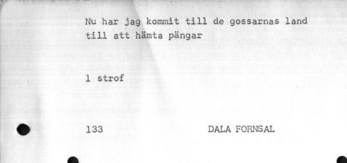//// Nu har jag kommit till de gossarnas land till att hämta pangar //// 1 strof //// ^ 133 DALA FORNS AL ////
