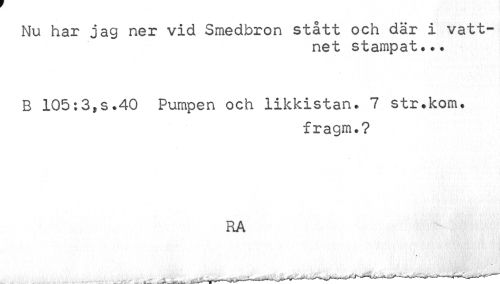 //// Nu har jag ner vid Smedbron stått och där i vattnet stampat... //// B 105;3fs.40 Pumpen och likkistan. 7 str.kom. //// fragm.? //// RA ////