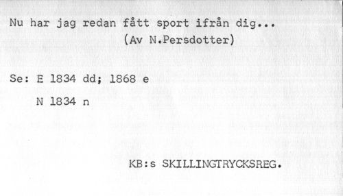 //// Nu har jag redan fått sport ifrån dig... //// (Av N.Persdotter) | //// Se: E 1834 dd; 1868 e N 1834 n //// KB:s SKILLINGTRYCKSREG. ////