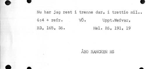 //// Nu har jag rest i trenne dar» i trettio mil.. 6:4 + refr. VÖ. Uppt.Wefvar, //// R3, 165, 36. Mel. R6, 191, 19 //// * //// ÅBO RANCKEN MS ////