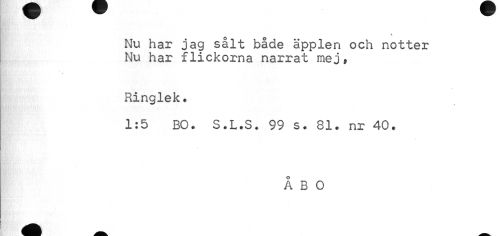 //// H ^ //// % //// O O //// Nu har jag salt bacle äpplen och nötter Nu har flickorna narrat mej. //// Ringlek. //// 1:5 BO. S.L.S. 99 s. 81. nr 40. //// ÅBO ////