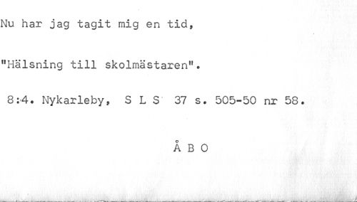 //// ^u har jag tagit mig en tid, //// i //// "Hälsning till skolmästaren". 8:4. Nykarleby, S L S" 37 s. 505-50 nr 58. //// ÅBO //// -___ _ _ ...—_____. _ __...__^Jmum____ ////