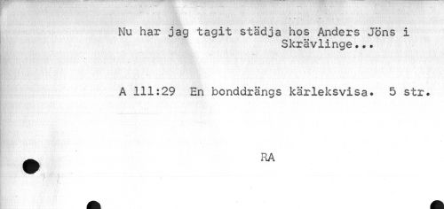 //// T -i- • , • . //// Nu har jag tagit städja hos Anders Jöns i //// Skrävlinge•.. //// A 111:29 En bonddrängs kärleksvisa• 5 str. //// • RA //// t ////