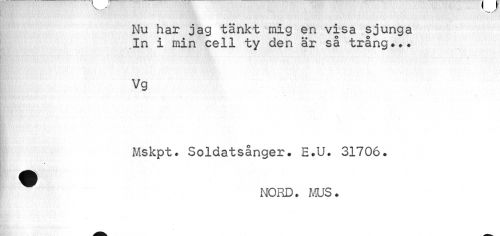 //// Nu har jag tänkt mig en visa sjunga In i min cell ty den är så trång.*. //// Vg //// Mskpt. Soldatsånger. E.U. 31706. ^ NORD. MUS. ////