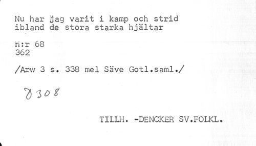 //// I I //// Nu har jag varit i kamp och strid ibland de stora starka hjältar //// ri:r 68 362 //// /Arw 3 s, 338 mel Säve Gotl.saml. //// /y-iot //// TILLH. -DENCKER SV.FOLKL. ////