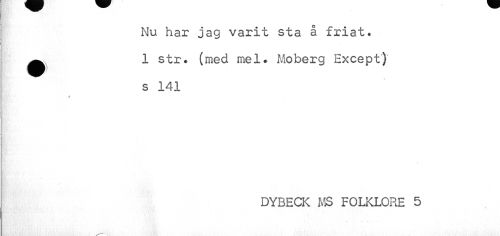 //// Nu har jag varit sta å friat. //// •1 str. (med mel. Moberg Except) s 141 //// i //// DYBECK MS FOLKLORE 5 ////