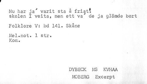 //// Nu har ja' varit sta å friat t //// skolen I veita* men ett va' de ja glömde bort //// Folklore V: bd 141. Skåne //// Mel.not. 1 str. //// Kom. //// * //// DYBECK MS KVHAA MOBERG Excerpt ////