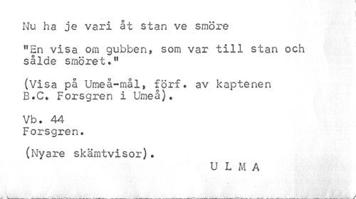 //// Nu ha je vari åt stan ve smöre //// lfEn visa om gubben, som var till stan och sålde smöret." //// (Visa på Umeå-mål, förf. av kaptenen B.C. Forsgren i Umeå). //// Vb. 44 Forsgren. //// (Nyare skämtvisor). //// U L M A ////