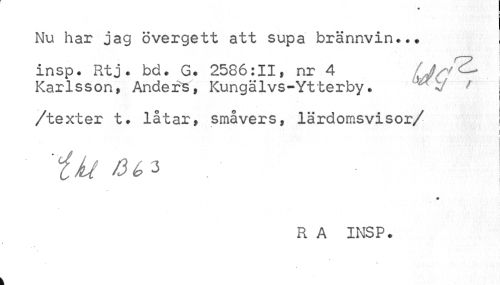 //// Nu har jag övergett att supa brännvin. //// insp. Rtj • bd. G* 2586:11, nr 4 LjC^ //// Karlsson, Anders, Kungälvs-Ytterby. ^J r //// /texter t. låtar, småvers, lärdomsvisor //// /i //// "tit bl* I //// R A INSP. ////