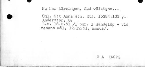 //// Nu har kärringen» Gud välsigne... //// Ögl. S:t Anna s:n» Rtj. 15284:133 y. Andersson» G. //// L.M. 16.8.51 /I pgr * I Händelöp - vid resans målf 12.12*51» manus/. //// R A INSPe //// Mi - //// ¦ • ' » //// • i — - v -_ ____ ¦ .....^^.... ^ ////