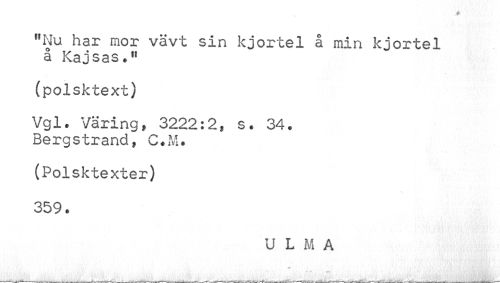//// .T //// "Nu har mor vävt sin kjortel å min kjortel a Kajsas." //// (polsktext) //// Vgl. Väring* 3222:2, s. 34. //// Bergstrand f O « iVi • //// (Polsktexter) 359. //// U L M A ////