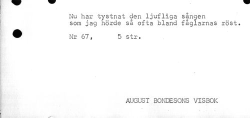 //// Nu har tystnat den ljufliga sången //// som jag hörde så ofta bland fåglarnas röst. //// ^ Nr 671 5 str. //// * //// AUGUST BONDESONS VISBOK //// % ////