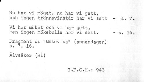 //// Nu har vi mögat, nu har vi gett, //// och ingen brännevinstår har vi sett - s. 7. //// Vi har mökat och vi har gett, //// men ingen mökebulle har vi sett. - s. 16. //// Fragment ur "Mökevisa" (annandagen) s. 7, 16. //// Älvsåker (Hl) //// 1 .. //// I.F.G.H.: 943 ////