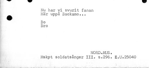//// Nu har vi svurit fanan //// •Här uppå Backamo... //// i I //// Bo Bro //// NORD.MUS„ //// Mskpt soldatsånger III. s.296. E.U.25040 //// A • A ////