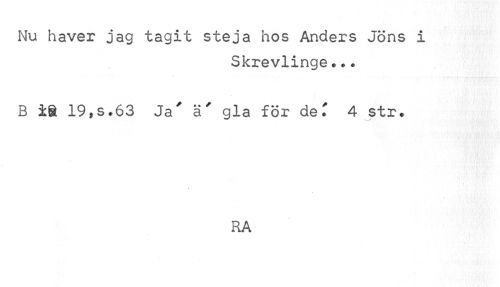 //// Nu haver jag tagit steja hos Anders Jöns i //// Skrevlinge*** //// B ig 19,s.63 Ja' ä' gla för deT 4 str* //// RA ////