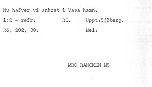 //// Nu hafver vi ankrat i Vasa hamn, //// 1:2 - refr. RE. Uppt.Sjöberg. //// R6» 202, 30. Mel. //// MBO RANCKEN MS ////