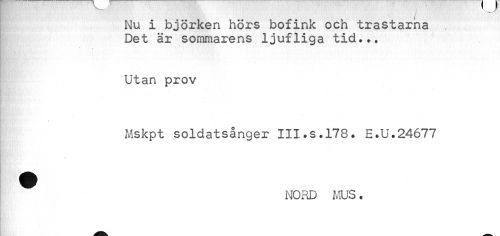 //// ¦ //// /Nu I björken hörs bofink och trastarna Det är sommarens ljufliga tid..* //// Utan prov //// Mskpt soldatsånger III.s.178. H.U.24677 //// ^ NORD MUS. ////