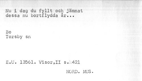 //// Nu i dag du fyllt och jämnat dessa nu bortflydda år... //// Bo //// Torsby sn //// E.U. 13561. Visor,II s.k421 //// NORD. MUS. ////