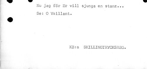 //// Nu jag för Er vill sjunga en stanz... Se: O Vaillant. //// » //// KB:s SKlLLINGTRYCKSREG. //// ? ////