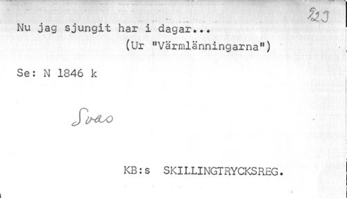 //// .. .....ZlJ //// Nu jag sjungit har i dagar... //// (Ur "Värmlänningarna") ' //// Se: N 1846 k //// JtrfUO //// i f //// i //// KB: s SKILLINGTRYCKSREG. //// » ////