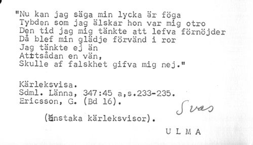 //// "Nu kan jag säga min lycka är föga Tybden som jag älskar hon var mig otro Den tid jag mig tänkte att lefva förnöjder Då blef min glädje förvänd i ror Jag tänkte ej än Atttsådan en vän, //// Skulle af falskhet gifva mig nej." Kärleksvisa. //// Sdrnl. Länna, 347:45 a,s.233-235. Ericsson, G* (Bd 16). r //// J U^O //// (Enstaka kärleksvisor). //// U L M A ////