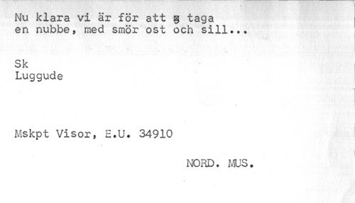 //// Nu klara vi är för att 55 taga en nubbe, med smör ost och sill... //// V - * //// Sk //// Luggude //// Mskpt Visor» E.U. 34910 //// r //// NORD. MUS. ////