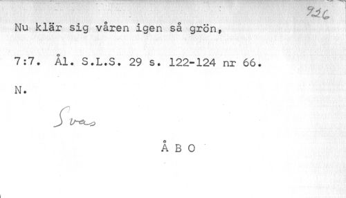 //// O //// Nu klär sig våren igen sa grön, //// 7:7. Ål. S.L.S. 29 s. 122-124 nr 66. N. //// S //// ÅBO' //// jr% ////