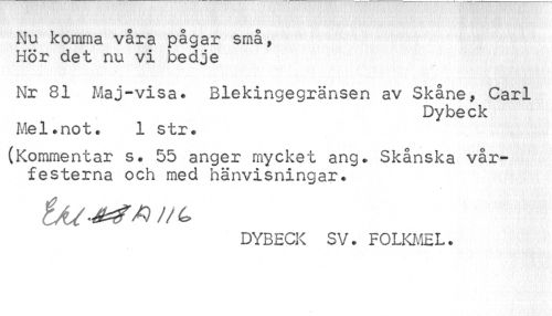 //// Nu komma våra pågar små, Hör det nu vi bedje //// Nr 81 Maj-visa. Blekingegränsen av Skåne, Carl //// Dybeck //// Mel.not. 1 str. //// (Kommentar s. 55 anger mycket ang. Skånska vårfesterna och med hänvisningar. //// Iåu // & //// DYBECK SV. FOLKMEL. ////
