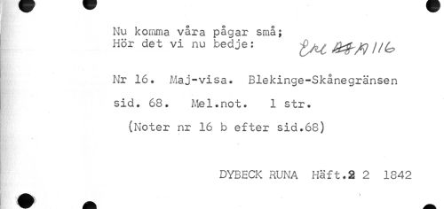 //// Nu komma våra pågar små; //// Hör det vi nu bedje: f/U. H^ //// Nr 16. Maj-visa. Blekinge-Skånegränsen sid. 68. Mel.not. 1 str. (Noter nr 16 b efter sid.68) //// 4 //// DYBECK RUNA Häft.2 2 1842 ////