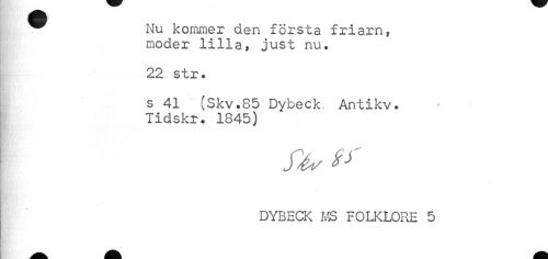 //// ^ Nu kommer den första friarn, //// moder lilla, just nu. //// 22 str. //// s 41 (Skv.85 Dybeck, Antikv. Tidskr. 1845) //// fév //// DYBECK MS FOLKLORE 5 ////