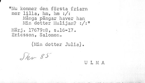 //// "Nu kommer den första friarn mor lilla* hm, hm :/: //// Många pangar haver han Min dotter Hulijan? :/:" //// Här j. 17679:8, s.16-17. Ericsson, Salomon. //// (Min dotter Julia). //// U L M A ////