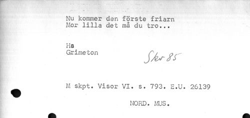 //// yJ^V1:' < • jmk ' -. ___ .¦ • ,L,- ;; • '•J //// ... .... , //// « ... //// Nu kommer den förste friarn //// Mor lilla det må du tro... //// ¦ //// Ha //// Grimeton //// M skpt. Visor VI. s. 793. E.U. 26139 //// ÉM fe. ^B B //// NORD. MUS. //// i ////
