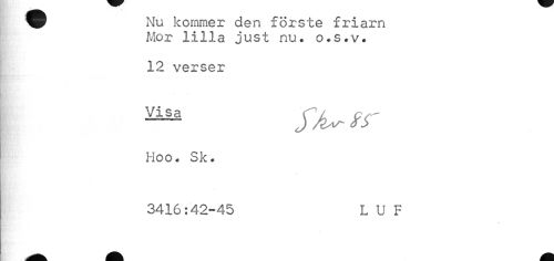 //// Nu kommer den förste friarn Mor lilla just nu. o.s.v. //// 12 verser //// ^ tr //// Hoo- Sk. //// 3416:42-45 LUF ////