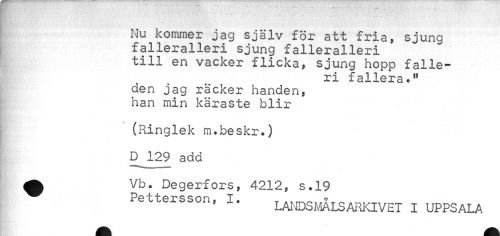 //// ' . ' //// ¦ ' - • - ' . . //// Nu kommer jag själv för att fria, sjung falleralleri sjung falleralleri till en vacker flicka, sjung hopp falleri fallera." //// den jag räcker handen, nan min käraste blir //// (Ringlek m.beskr.) //// DJ£9 add //// A Vb. Degerfors, 4212, s.19 //// Pettersson, I. LANDSMÅLSARKIVET I UPPSALA ////