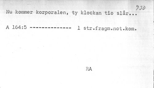 //// Nu kommer korporalen» ty klockan tio slår... A 164:5----- 1 str.fragm.not.kom. //// i //// 'vä», -V //// | //// i I //// ! //// RA ////