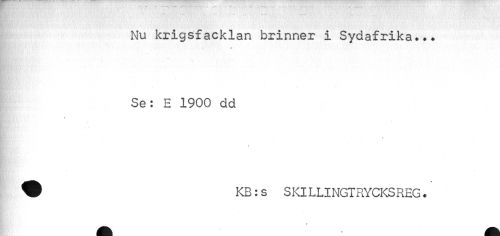 //// I - - • • -- - - //// Nu krigsfacklan brinner i Sydafrika... //// * //// r : ¦ , r " ' ' • ..... //// Se: E 1900 dd //// » //// i //// » //// W KB:s SKILLINGTRYCKSREG. //// # //// A ////