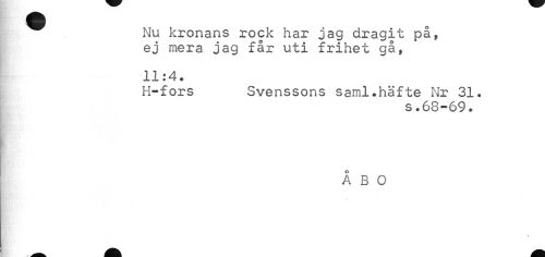 //// Nu kronans rock har jag dragit på, ej mera jag får uti frihet gå, //// 11:4. //// H-fors Svenssons saml.häfte Nr 31. //// s.68-69. //// ÅBO ////